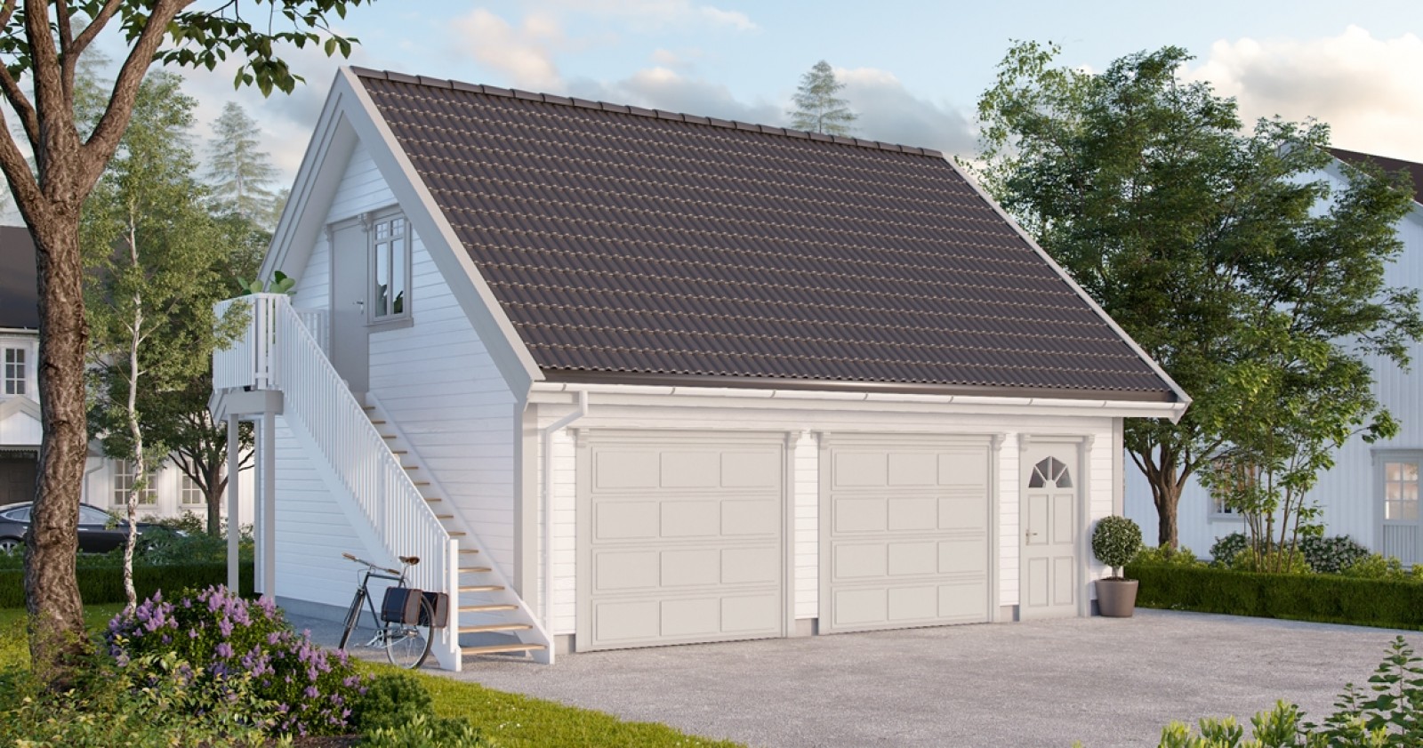 Bygget har en klassisk og fin fasade, som vil stå godt til boligen din. Vinduer på alle byggets vegger slipper inn mye lys, og en dør plassert på vestveggen lar deg gå inn og ut av garasjen uten å måtte lukke opp garasjeportene.