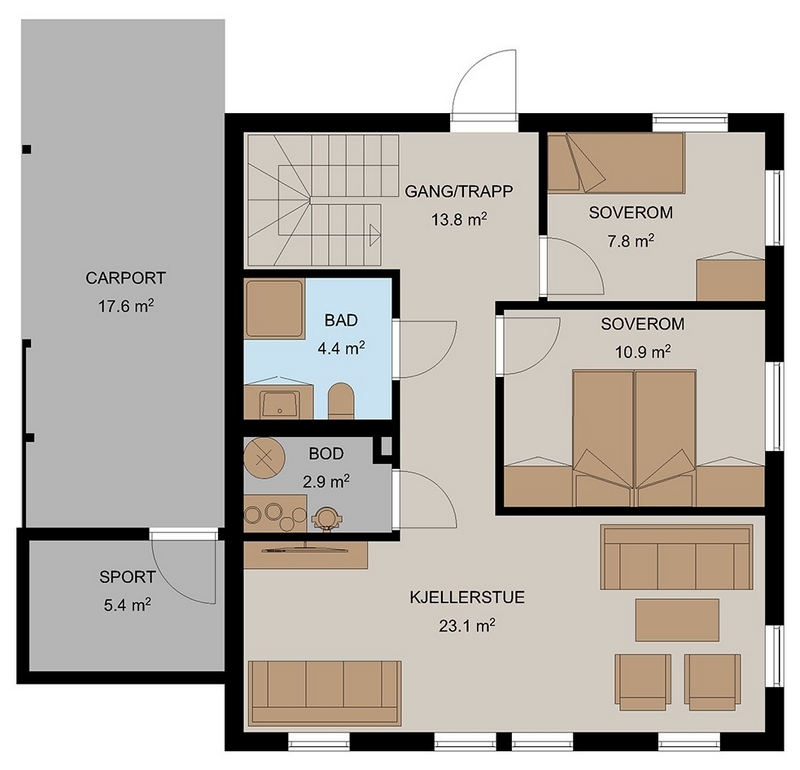 Det første man ser når man kommer inn i boligen, er en gjennomgående gang som leder til en stor kjellerstue i første etasje. Vinduer i kjellerstuen sørger for en godt opplyst entre, i tillegg til vinduer i trappeoppgangen som gir et lyst og imøtekommende inntrykk. I første etasje har du tilgang til to av husets tre soverom, et romslig bad og bod. På grunnplanet finner du også en overbygd carport (under verandaen) og en sportsbod.