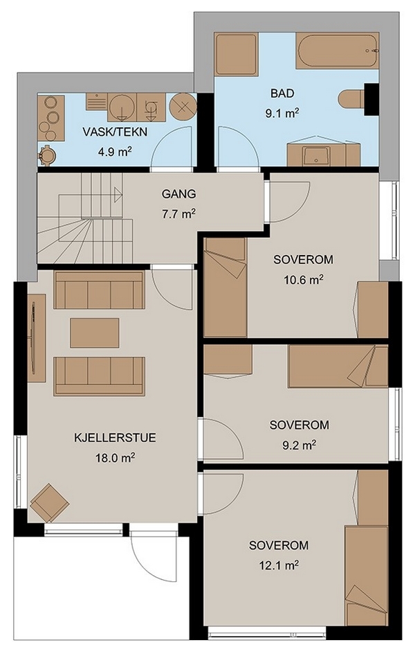 I underetasjen er det ytterligere tre soverom, vaskerom/teknisk rom, familiebad og en praktisk kjellerstue med utgang til overbygd terrasse og hage.