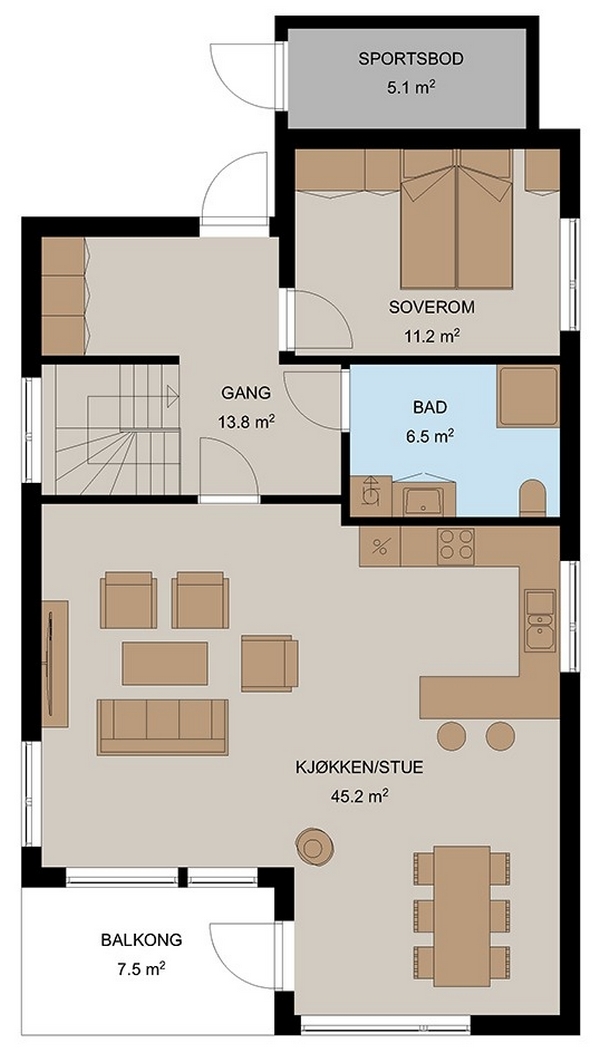 Du kommer inn i Giske’s andre etasje via et overbygd inngangsparti og finner en gang med god plass til oppbevaring. Herfra har du også tilgang til husets største soverom, et stort bad og det sosiale allrommet på hele 45,2m2 med kjøkken- og stueområde. Her er det høyt under taket, og sammen med de store, spesielle vindusflatene er denne boligen noe helt utenom det vanlige. Fra stue er det utgang til en trivelig veranda med rekkverk i glass som slipper mye lys direkte inn i allrommet.